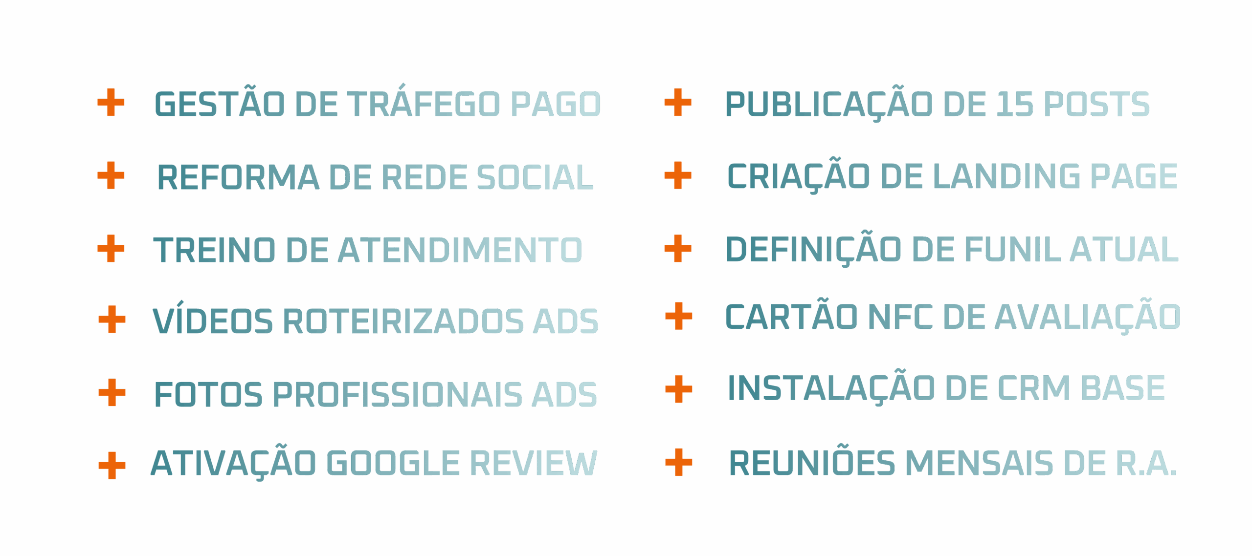 O investimento vai para coisas que ficam e geram resultado: campanhas planejadas por fases, criativos próprios, landing page conectada ao WhatsApp, CRM para organizar os contatos, script de vendas e Google Meu Negócio atualizado com reforço de avaliações. Em 90 dias, a empresa sai com funil e canais prontos para trabalhar.